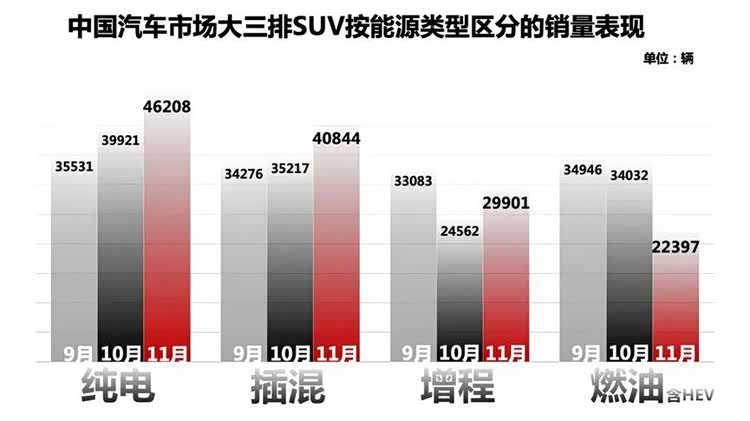 近日,中汽协、乘联会零售量最新数据显示,11 月大三排SUV市场里,纯电的销量超过46,209台,纯电大三排SUV销量环比上升16%,创历史新高。而增程销量29,902台,持续遇冷,连续5个月同比下滑。燃油销量22,398台,下滑也比较明显。继9月首次超过增程、燃油、插混后,纯电大三排销量已连续三个月排名所有动力形式榜首。