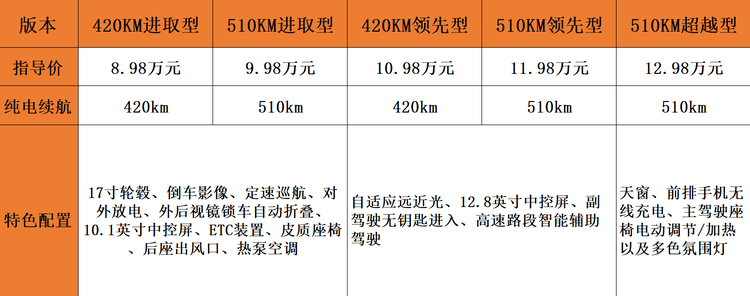 该车全系共提供了8个配置版本,我们先来看两款420km纯电续航版本,它们分别是指导价格8.98万元的420KM进取型和指导价格10.98万元的420KM领先型。