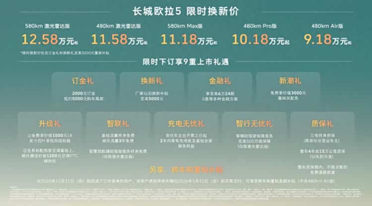 近日,长城汽车欧拉品牌全新A级纯电SUV——长城欧拉5正式上市。新车共推出5款配置,建议零售价区间为 9.98万至13.38万元,限时换新价9.18万元起。为回馈广大用户的热爱与支持,即日起至2025年12月31日,用户下订并锁单即可尊享包含订金礼、换新礼、智行无忧礼在内的9重上市好礼,以及跨年购置税补贴(不含480km Air版)等丰厚购车权益。凭借诚意十足的价格权益与越级产品力,长城欧拉5致力于成为全球年轻用户的“严选搭子”。