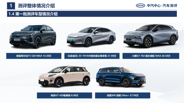测试首批选取了5款不同价位的主流新能源车型,分别为8.98万的埃安UT420智豪版、14.38万的极狐阿尔法T5520MAX、20.58万的 小鹏G7(参数|询价)702超长续航MAX、21.98万的比亚迪汉LEV701KM激光雷达尊享型及27.99万的深蓝S09后驱Ultra+,可以看出,高端测试车占比相对较高。