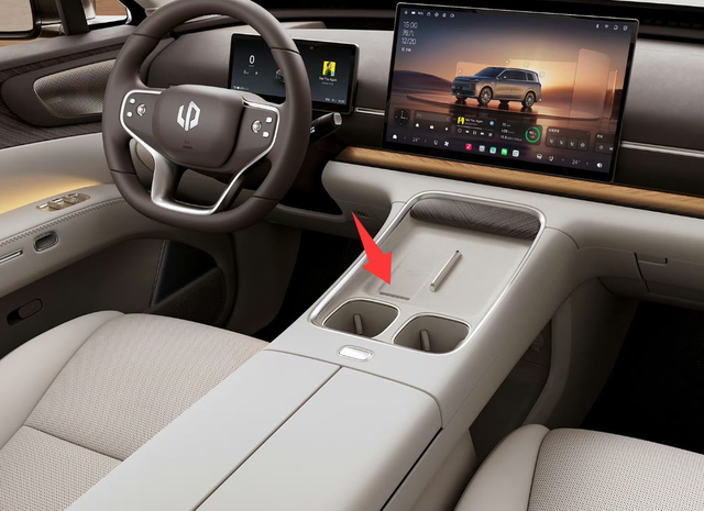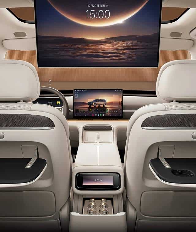 从这个视角看,两个小桌板,冰箱安排了,中央通道的小液晶屏也有,第二排的娱乐屏也够大,这么看的话,这个设计风格实际上和深蓝S09比较类似,你可以说设计感一般,但是也丑不到哪里去。当然,等老图哪天看到实车了,还会再做一期动态视频解读。