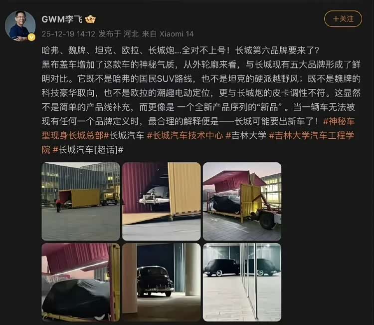 几乎就在同一天,长城汽车的线控底盘总工程师李飞也在微博分享了一组这台被罩上黑布的汽车照片。他直接判断,这台车和长城现有的五大品牌都对不上号,因此不会是简单的产品线补充,而更像是一个全新产品序列的“新品”。