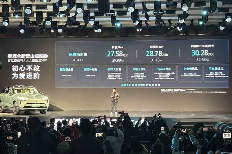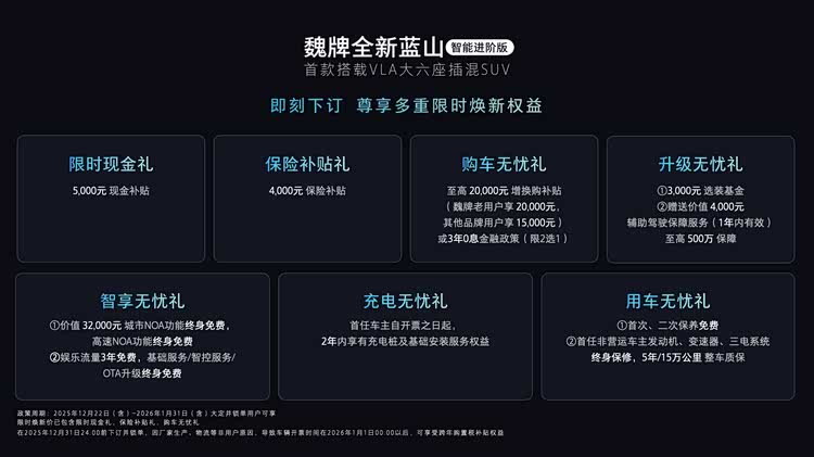 2025年12月22日,魏牌全新蓝山智能进阶版正式上市,新车售价为29.98万至32.68万元,限时焕新价区间为27.58万至30.28万元。作为改款车型,成为首款搭载长城汽车VLA大模型的大六座插混SUV。它提供全新⼀代CP Master辅助驾驶系统。Hi4性能版智能电混四驱,新增阻尼预瞄功能,提前识别减速带等路⾯凸起并调整悬架阻尼,提升底盘舒适性。