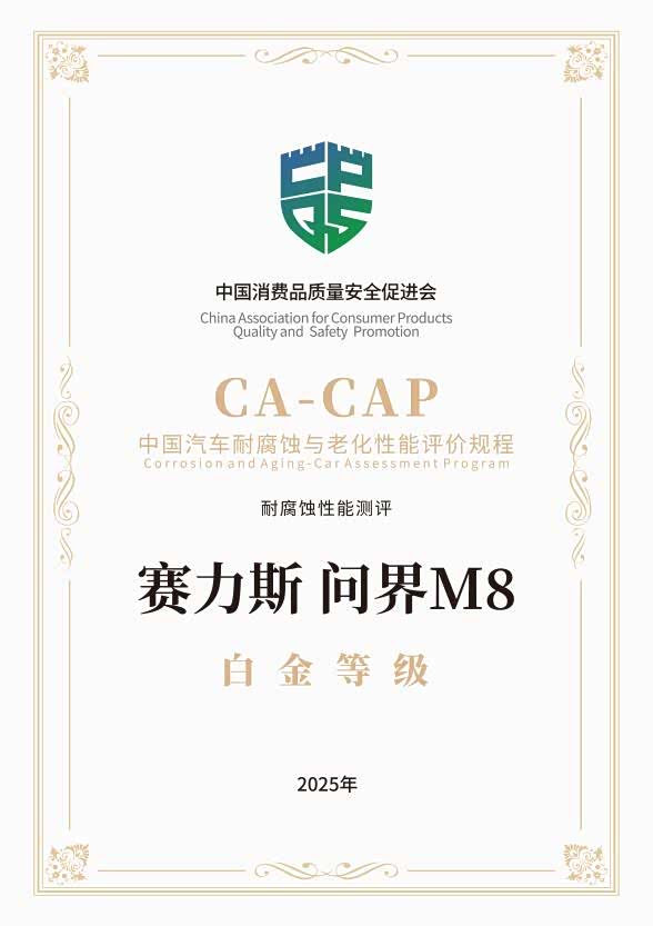 CA-CAP是在中国消费品质量安全促进会的指导下,由海南热带汽车试验有限公司牵头开展的一项面向行业的权威测评,自2022年至2025年已连续开展四届,累计认证25款车型,涉及22个汽车品牌。此次问界M8获奖,充分印证了其在复杂环境下卓越的耐腐蚀性能。