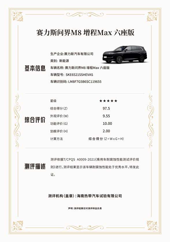 12月19日,中国汽车耐腐蚀与老化性能评价(CA-CAP)测评结果正式揭晓,问界M8增程MAX六座版荣获整车耐腐蚀性能测评“白金等级”证书,并以97.5的综合评分摘得最高五星评级。该成绩不仅是本届测评的最高得分,更刷新了CA-CAP历史认证车型最高分纪录。
