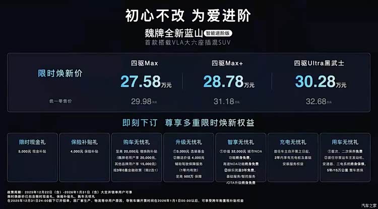 对于刚刚上市的新款魏牌蓝山,虽然其官方指导价格依然为29.98万元起,但官方限时焕新价为27.58万元,对于一款30万元车型而言,2.4万元的降价可以提升竞争力。此外,新车还配备了VLA大模型,通过语音控车、CoT推理卡片、防御性驾驶、特殊场景理解四大功能,实现从感知到执行的智能闭环。让车辆的辅助驾驶从“机械执行”转向“人性理解”,从“无畏”转向“敬畏”。为了保证VLA大模型的流畅运行,新车还搭载了算力达700 TOPS的Thor-U芯片,像能够持续提供高稳定而充沛的算力。同时,其还配备27颗智慧传感器,通过合理的布局,高效的协同,能够在雨雾等复杂环境下,快速识别潜在风险。可以毫不夸张的说,即便是和喜欢“堆料”的新势力品牌新能源车型相比,新款蓝山在智能化配置方面也不处于下风。与那些辅助驾驶系统仅提供给高配车型或需要选装的新势力车型不同,新款蓝山全系标配城市路段和高速路段辅助驾驶。相比老款蓝山,新车不仅将城市道路辅助驾驶升级为标配,还配备将后排液晶屏幕也从选装变高配,可谓是降价还增配。