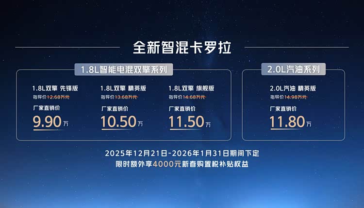 12月21日,“全球好品质 中国新家轿”全新智混卡罗拉焕新上市,共推出4个版本,厂商直销价为:9.9万元-11.8万元。即日起至1月31日期间下定,限时额外享受4000元新春购置税补贴权益。