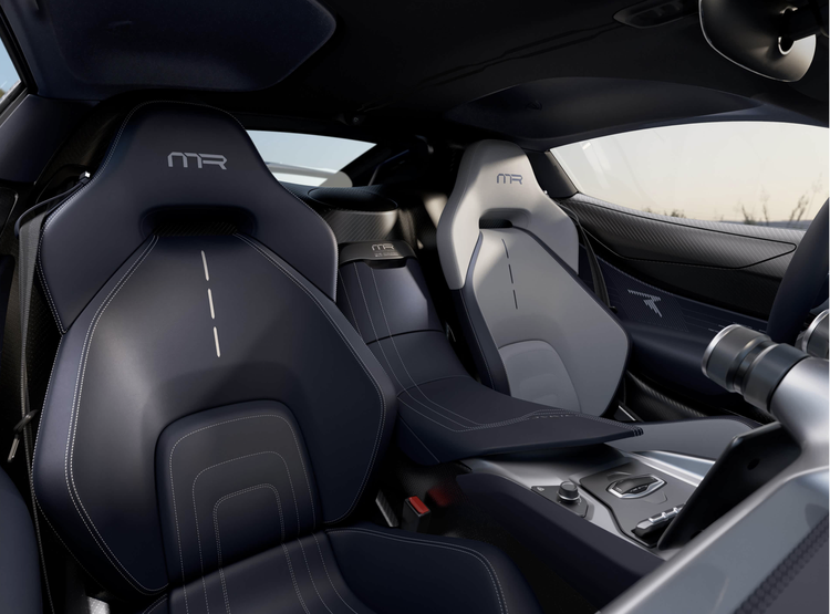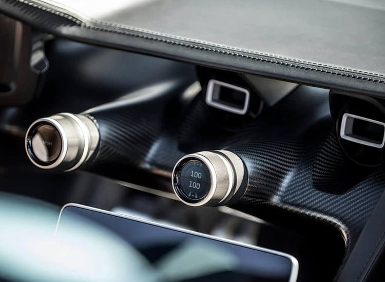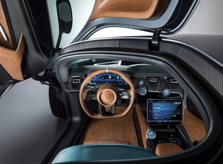 Rimac Nevera R Founder's Edition特别版车内的设计也十分精巧,配备了两个符合人体工学设计的赛车座椅,右侧驾驶员席位的座椅采用了米白色,副驾驶座椅采用了黑灰色,头枕加入了“MR”手工刺绣,靠背还带有三条竖状的条纹,坐垫和靠背还加入了回纹防滑坐垫。小尺寸的方向盘在12点方向加入了蓝色徽标,全液晶仪表、矩形中控大屏,都是为显示一些驾驶信息而设计的,并非娱乐属性屏幕。随处可见的“10 of 10”金属铭牌也凸显出它的限量版的身份。