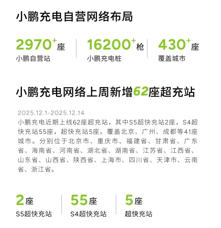 车家号·0浏览·2025-12-22 23:45 · 广东近日,我们从官方渠道获悉,小鹏汽车在 12 月 1 号~14 号期间新增上线小鹏超充站 62 座。截至目前,小鹏充电自营网络布局共有 2970 座直营站、16200 枪充电桩,覆盖城市 430 座。