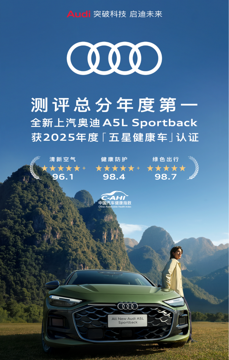 近日,中国汽车工程研究院正式发布2025年度C-AHI中国汽车健康指数测评结果。全新上汽奥迪A5L Sportback凭借全维度卓越表现,荣获“五星健康车”称号,并以总分第一的成绩登顶年度榜单。这不仅展现了其在健康座舱领域的领先实力,更体现了上汽奥迪以创新科技引领行业健康出行的品牌承诺,在每一个细节都做到极致。