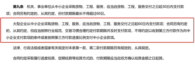 2025年6月1日,新修订的《保障中小企业款项支付条例》正式施行。条例中明确规定,大型企业从中小企业采购货物、工程、服务,应当自货物、工程、服务交付之日起60日内支付款项。合同另有约定的,从其约定,但应当按照行业规范、交易习惯合理约定付款期限并及时支付款项,不得约定以收到第三方付款作为向中小企业支付款项的条件或者按照第三方付款进度比例支付中小企业款项。