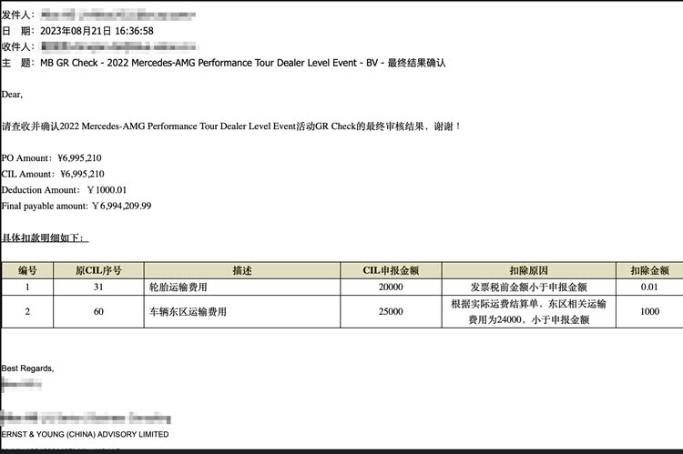 该供应商称,双方合作的AMG Performance Tour Dealer Level项目在2022年便已完成交付,其中80%的款项由梅赛德斯-奔驰(中国)于2022年10月10日前结算完毕,其于2023年1月17日结算各自承担部分。剩余20%尾款的终审工作由经梅赛德斯-奔驰(中国)委托的第三方审计机构安永(中国)企业咨询有限公司【Ernst & Young (China) Advisory Limited】于2023年8月21日出具。审计报告明确载明:付款金额为6,995,210元,审减金额为1,000.01元,审定应付金额为6,994,209.99元。也就是说,剩余的19.9%尾款可以立即进入开票支付流程。