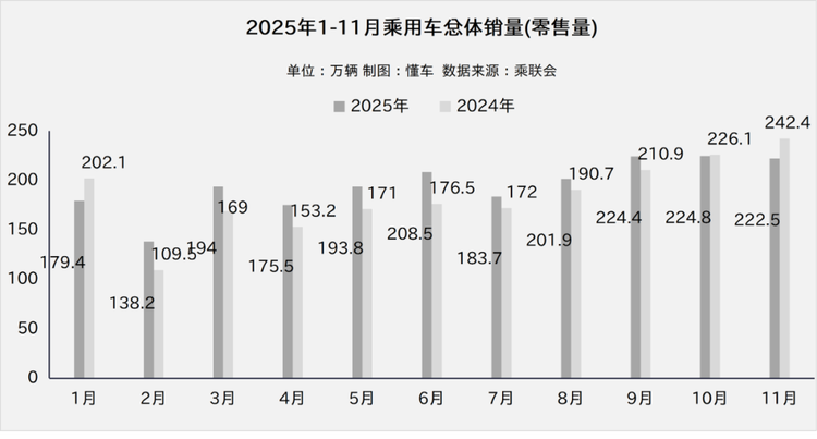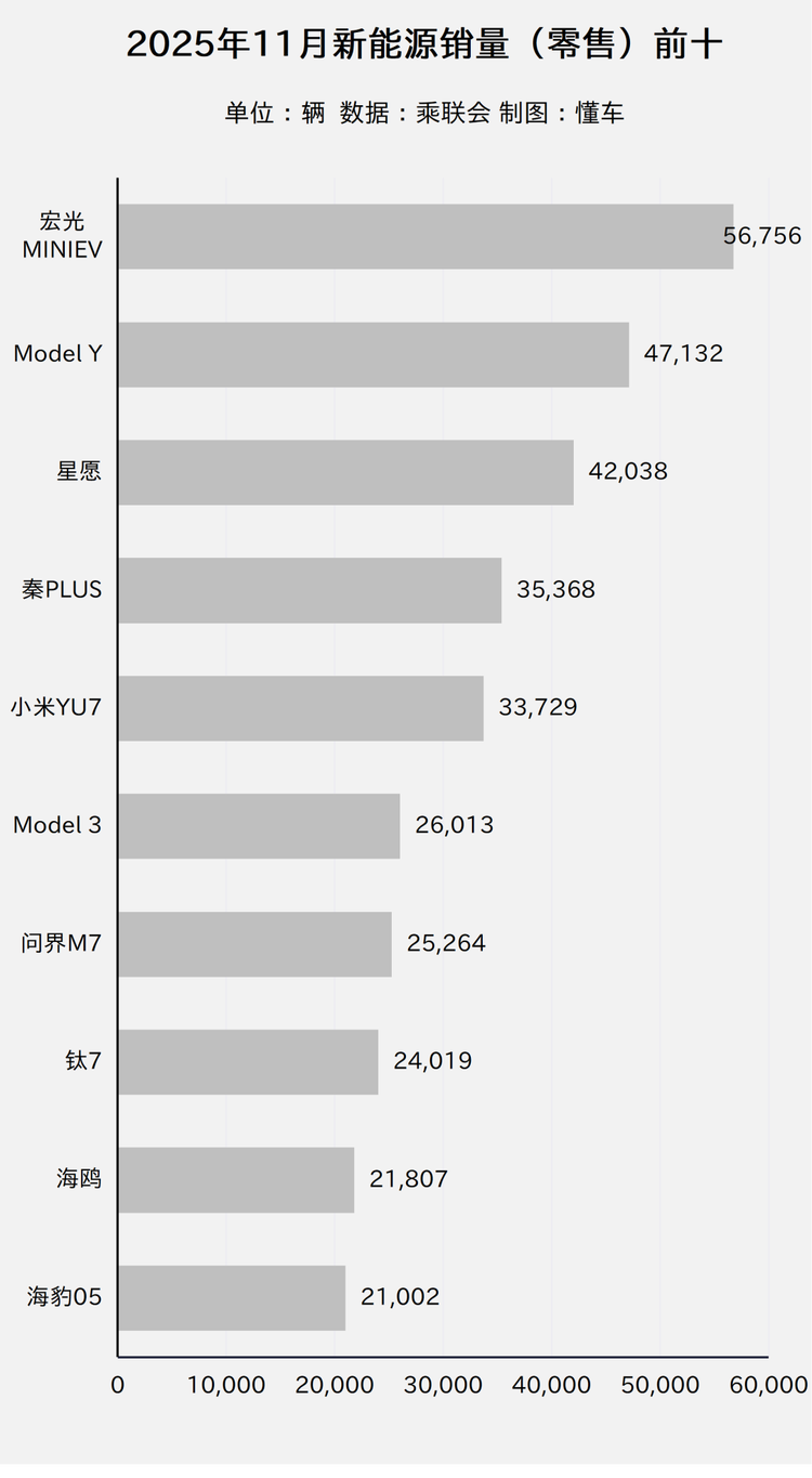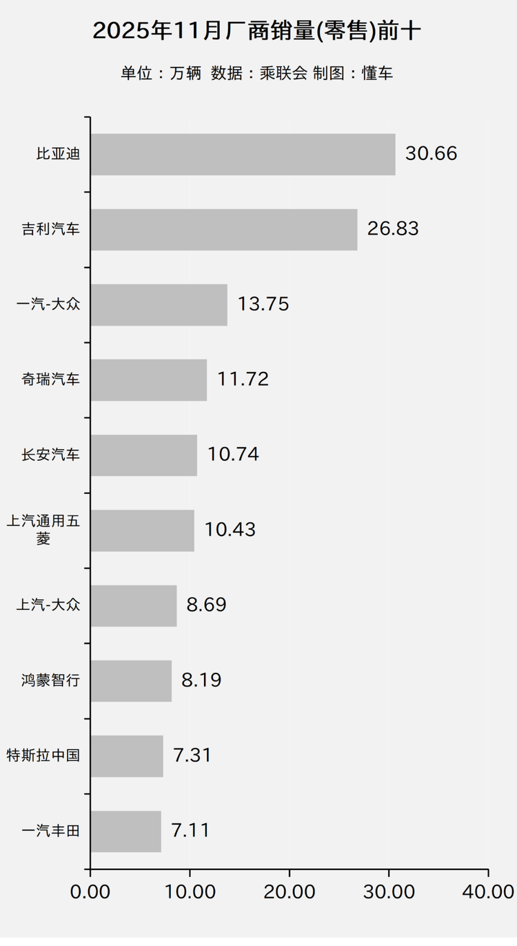 近日,乘联会(cpcaauto.com)公布了2025年11月汽车(乘用车)销量(零售)数据: