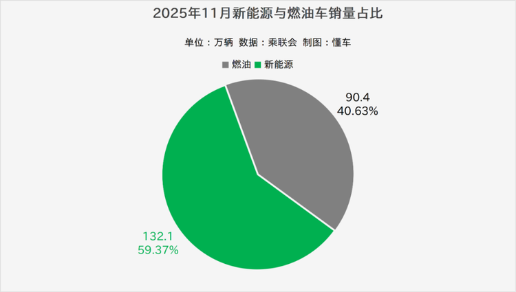 新能源方面,11月新能源销量为132.1万辆,同比增长4.2%,环比增长3.0%,新能源渗透率为59.37%,比燃油车多了41.7万辆。