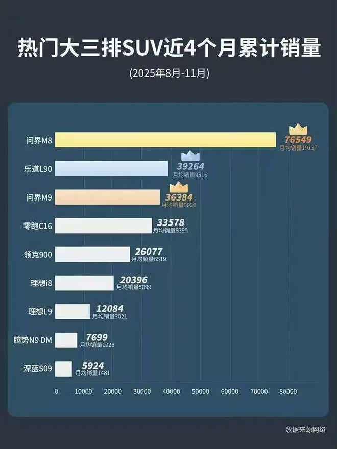 三排 SUV 市场除了新推出的产品,还有热卖的问界 M9、M8、M7;理想的 L9、L8;蔚来 ES8、乐道 L90等,