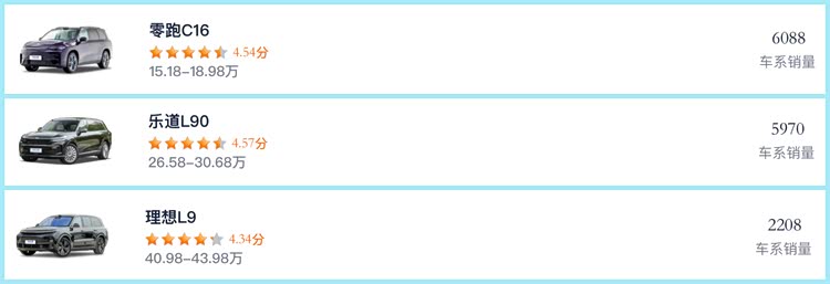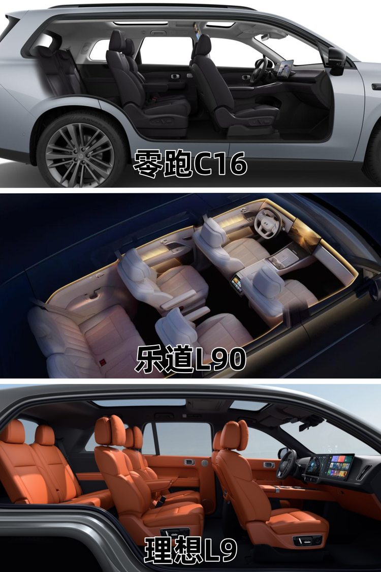 从价格层面不难看出,三款车型面向的是不同预算的家用消费群体。零跑C16以15万起、顶配18万不到的定价,精准契合了追求高性价比的家庭用户需求,无论是首次购车还是增购,都能轻松负担。而乐道L90和理想L9的定价,则对应着愿意为更高阶的产品定位和配置体验投入更多预算的消费群体,各自有着明确的受众圈层。