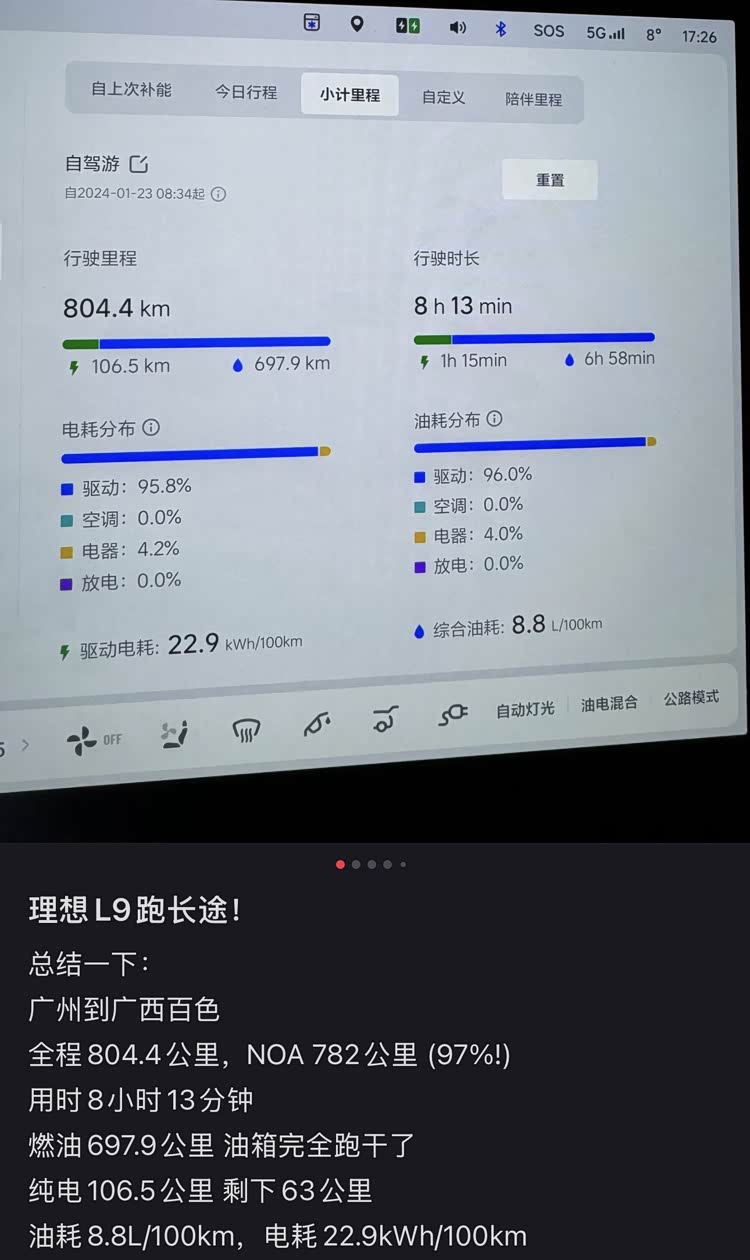 这位理想L9车主分享了他的长途电耗,全程800多公里,驱动电耗都达到了22.9kwh/100km,其他电器电耗占比4.2%,可以看出来这个电耗水平是偏高的,如果是顶着120km/h的速度跑,电耗和油耗会更高,但考虑到理想L9净重2.5吨,满载质量达到3吨以上,也就不奇怪这台车为什么电耗高了。