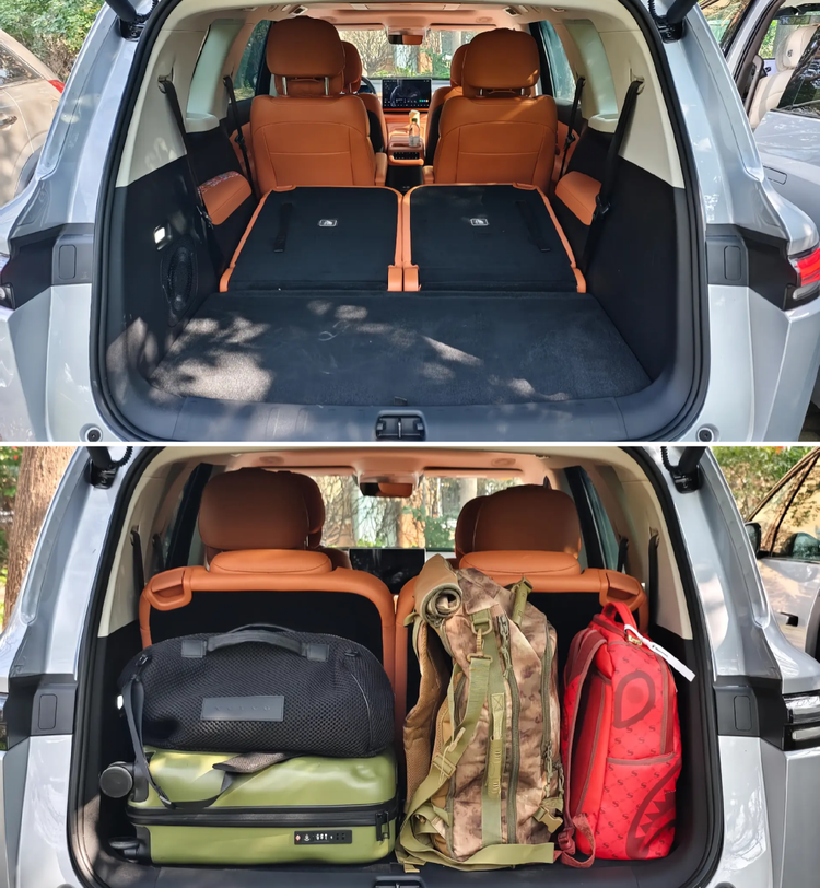 乐道L90的车内空间表现同样出色,3110mm的超大轴距为三排空间提供充足保障,乘坐舒适不压抑,该车型特色之一就是“很能装”,满载6人的情况下,还能塞下9个标准登机箱外加1个儿童行李箱,而且纯电车型的前备厢设计进一步提升了空间实用性,装载能力相当可观。