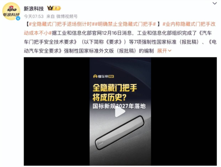 12月19日,#明确禁止全隐藏式门把手#话题强势冲上热搜,瞬间引发全网热议。有人直呼“早该规范了”,也有人好奇“新规到底管什么”,这场关于汽车车门把手的“安全整顿”,其实早已酝酿已久。