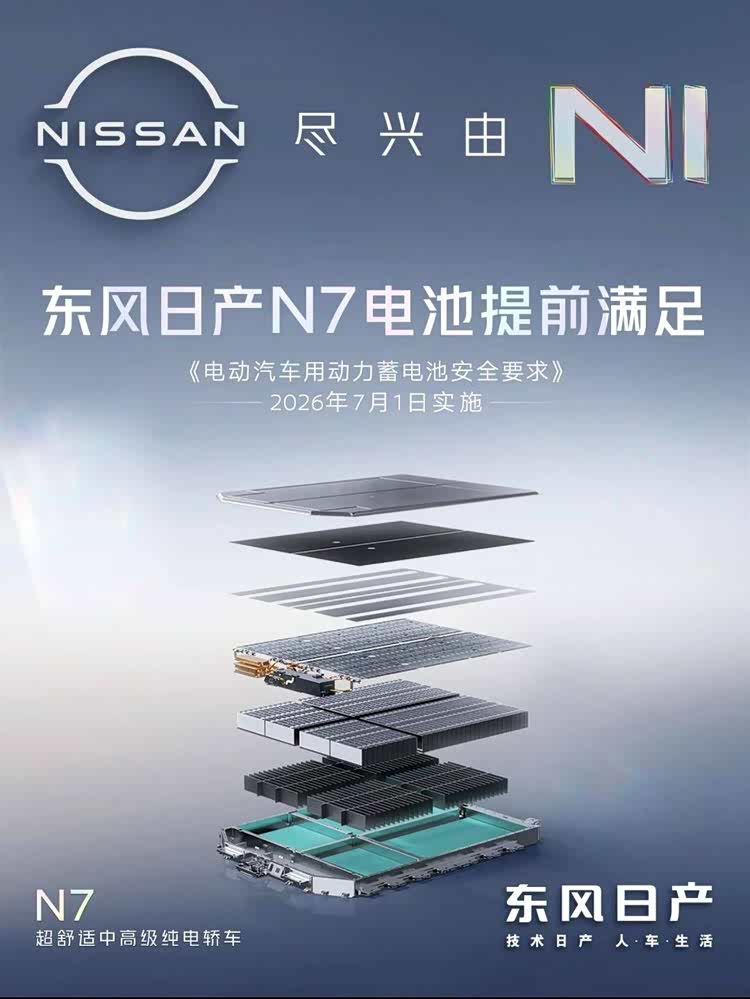 而面对即将在2026年7月正式实施的动力电池新国标,日产N7搭载的电池包通过行业首个“四针刺多电芯整包无热蔓延试验”,提前满足2026年新国标新增的“热扩散、底部撞击、快充循环后安全”3项新标准,并且三电终身质保政策,彻底解决用户的“售后焦虑”。