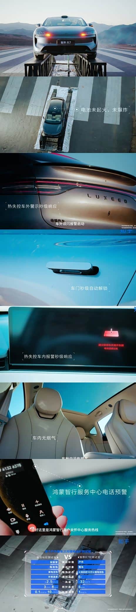 除了上述三项针对性测试,智界R7的电池安全体系还覆盖了物理结构、电芯材料、热管理等多个维度,并引入了基于数据监测的安全预警机制。该系统宣称可提前识别如内短路、鼓包等潜在隐患,实现从被动安全防护向主动风险预警的过渡。