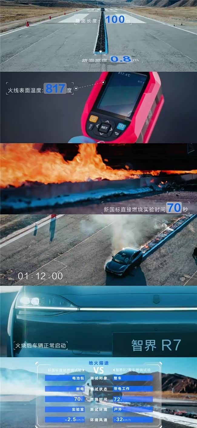 高温环境是对动力电池安全性的严峻考验,涉及夏季暴晒、高功率快充及周边火情等多种实际场景。为验证电池在极端高温下的稳定性,智界R7进行了一项高温火焰炙烤测试。