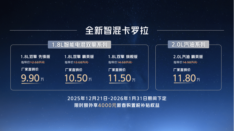 作为享誉全球的畅销车型, 丰田卡罗拉(参数|询价)用实打实的销量数据证明了自己的出众实力与可靠品质。在中国市场,卡罗拉通过持续迭代更新,收获了销量与口碑的双赢,保值率也位居细分市场前列。在智电浪潮下,卡罗拉紧跟时代步伐,聚焦智能化和节油性做了很多改进。日前,全新智混卡罗拉上市,官方指导价为12.68万元至14.98万元,厂家直销价为9.90万元至11.80万元,相当于优惠幅度为2.78万元至3.18万元。此外,在2026年1月31日之前购车还可额外享受4000元的新春购置税补贴权益,让消费者的购车门槛进一步下降。