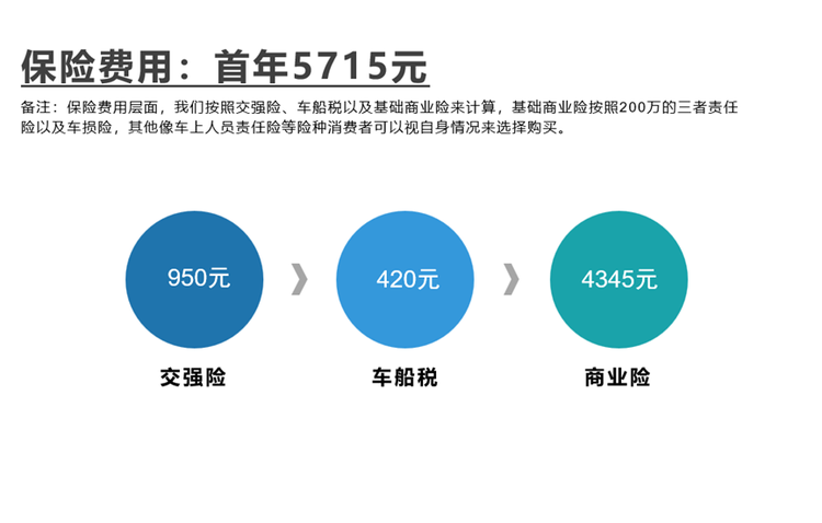 保险费用层面,我们按照交强险、车船税以及基础商业险来计算,基础商业险按照200万的三者责任险以及车损险,其他像车上人员责任险等额外险种消费者可以视自身情况来选择购买。另外,此价格也不考虑之后几年不出险的折扣以及保险公司的优惠等。