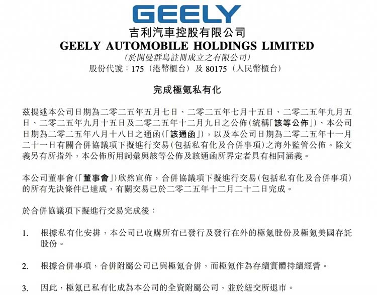 就在12月22日晚,吉利汽车宣布完成极氪私有化,极氪从纽交所正式退市。至此,这个以“史上最快上市”纪录登陆美股的极氪,在上市仅一年多后,便以母公司私有化退市的方式,闪电般结束了其短暂的独立上市公司生涯,成为了“史上最快退市”美股的中国车企。这一“快上快下”的资本操作,表面上看似一次简单的集团内部资产腾挪,实则并非这么简单。