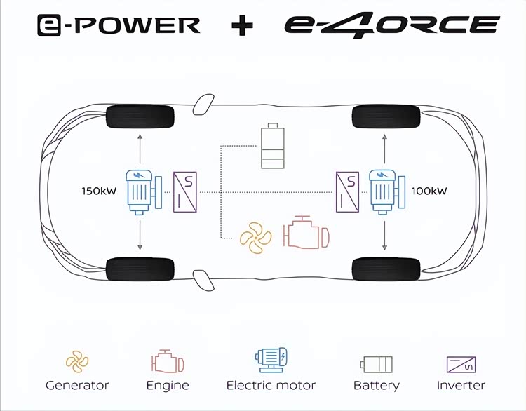 第四代日产X-Trail e-Power采用了e-4ORCE四驱系统,搭载1.5L Turbo三缸引擎,作为发电机,为1.8kWh电池组提供电力。
