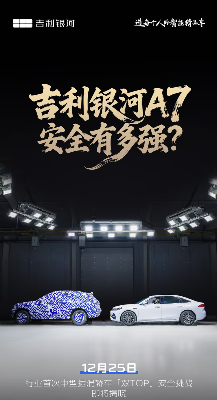 12月25日见证首次中型插混轿车「双TOP」挑战!家轿安全看银河A7