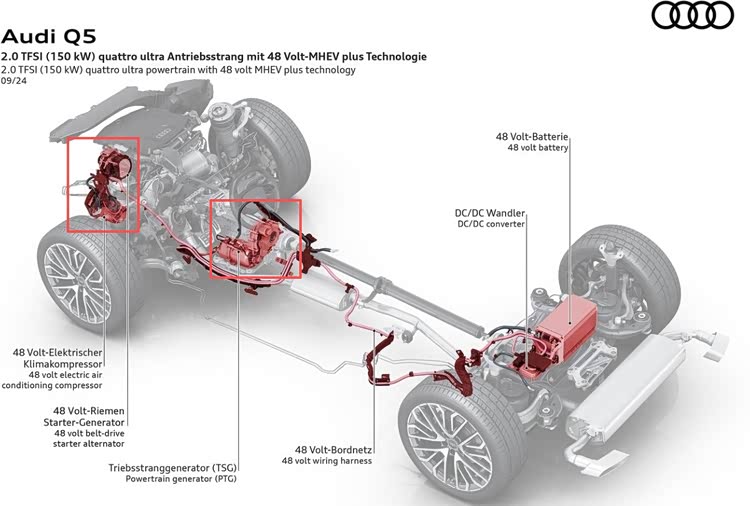 有趣的是,单纯从发动机特性来看,新款发动机的峰值扭矩爆发转速更高,理论上低速起步响应不如老款直接。但奥迪的解决方案是引入48V PLUS轻混系统。这套系统中的PTG电机可产生230Nm的扭矩和24马力功率,高于传统48V轻混电机。一方面将百公里加速时间从9.1秒缩短至7.1秒,也可以在低速时单独驱动车辆,减少发动机介入。