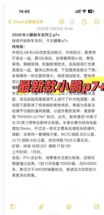 最近小红书上的 “小鹏新车剧透” 直接勾住了车友的魂 ——2026 年 1 月要上的小鹏 P7+,不仅外观照搬 G6/G9 的 “科技感” 设计,还偷偷把轴距加长了 15mm,连续航和价格都给了明确预期,有博主直言 “这款车关注度超高,有望成仅次于 M03 的销量担当”。