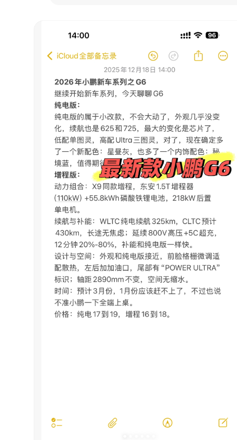 车家号·0浏览·2025-12-23 17:43 · 广东小鹏 G6 的 2026 款改款堪称 “低调的实用党福利”—— 外观几乎没变,却偷偷加了新配色、降了增程版价格,还把 800V 超充的补能效率拉满,有博主爆料 “这款车纯电 17 万起,增程 16 万就能拿下”,性价比直接卷到同级天花板。