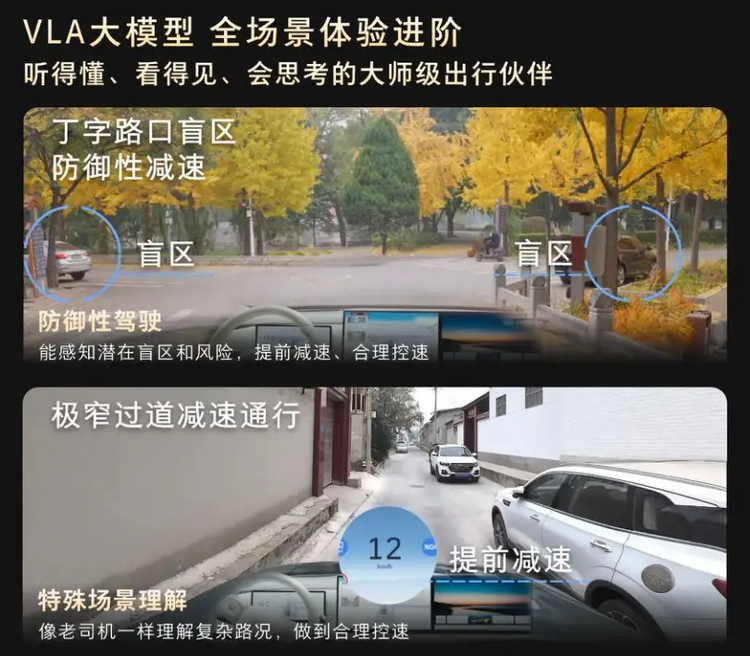 像端到端只能做到 “看见行人减速”,而 VLA 能面对尚未显现风险作出判断,比如途径临停大车,或被围挡遮挡的施工现场,它会推理出道路可能变窄或存在发生 “鬼探头” 的概率,从而提前减速、主动避让。