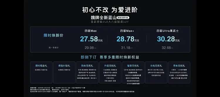 昨晚,长城汽车旗下的魏牌全新蓝山,又迎来一个全新版本——智能进阶版,指导价29.98万起,限时焕新价格为27.58万起。