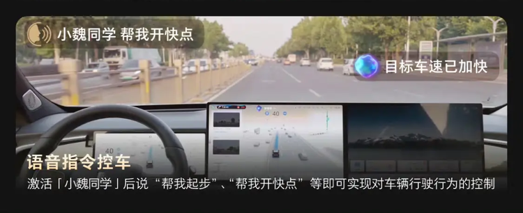 用户可以通过激活“小魏同学”语音助手,发出 “远离大车”、“开慢一点” 等口令完成车辆控制,道路拥堵怕被加塞,只需要说“跟近前车”,系统就会自动调节跟车时距,避免被加塞,出行效率更高,也可通过“帮我起步”来激活NOA。