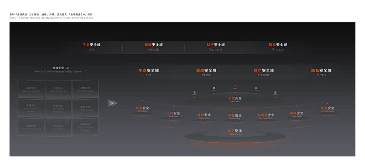 作为行业安全技术的先行者与引领者,吉利在“全域AI”技术体系的赋能下,以“AI为纲 责任为本”,基于原有的“全域安全”技术体系进阶打造“全域安全2.0”技术体系。结合智能时代的安全新需求和新挑战,“全域安全2.0”技术体系秉持“以人为尊”理念,通过技术升级、能力突破与范式创新,将侧重“整车安全”的视角升级为“人-车-路-云-星”的生态视角,旨在贯穿用户出行全场景、覆盖出行全领域、联动出行全生态;并以“生命零伤亡、健康零危害、财产零损失、隐私零泄露”四大安全愿景为指引,逐步构建的一套为消费者提供全面的安全保障技术体系。