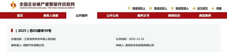 12月22日,观致汽车有限公司新增一则破产审查案件,申请人为深圳欣本供应链有限公司,经办法院为江苏省苏州市中级人民法院。