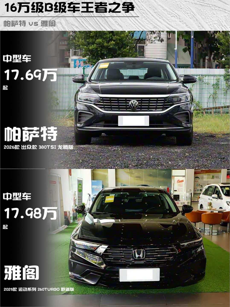 车家号·0浏览·2025-12-23 18:45 · 北京最近在纠结 帕萨特(参数|询价)2026款出众款380TSI龙腾版和雅阁2025款运动系列260TURBO舒适版的朋友看过来!深度对比这两款B级车标杆,帮你理清思路💡
