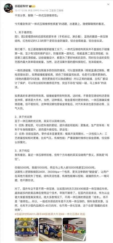 魏建军对一体化压铸的看法很快就在网络上形成了“一体化压铸无用论”的观点,而理想汽车材料负责人段吉超“主动应战”,更是将网络舆论对一体化压铸的讨论热度推向了新的高度。