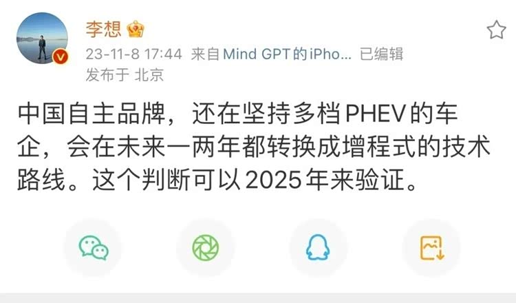 不可否认的是,中国车企之间虽然隔三差五打嘴仗,但却在这种你追我赶的氛围之中不知不觉实现了技术进步。两年前,理想和长城就增程和多挡插混技术进行过争论,当时理想汽车CEO李想放言称“中国自主品牌,还在坚持多档PHEV的车企,会在未来一两年都转换成增程式的技术路线。这个判断可以2025年来验证。”