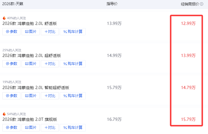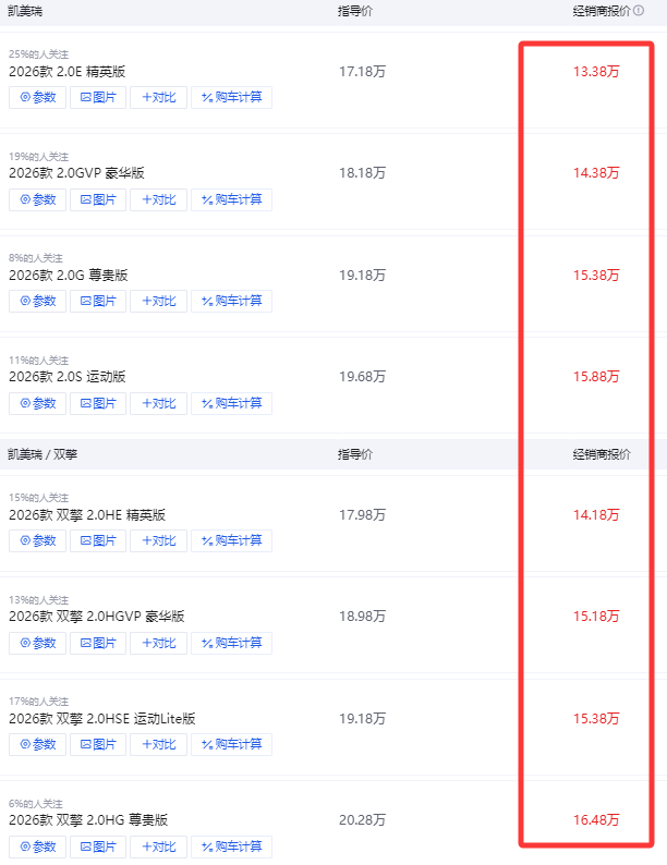 再来说说,凯美瑞,也是以2026款为例。虽然这车刚上市没多久,但为了保销量,终端也有不小的松动,入门版裸车价也在往13-15万靠。