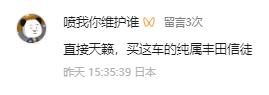 后来我看了一下车友们的留言评论,不能说百分之九十吧,至少百分之八十认为广汽丰田给雷凌L的定价过于自信了,甚至有的直接开喷,措辞相当严厉啊。