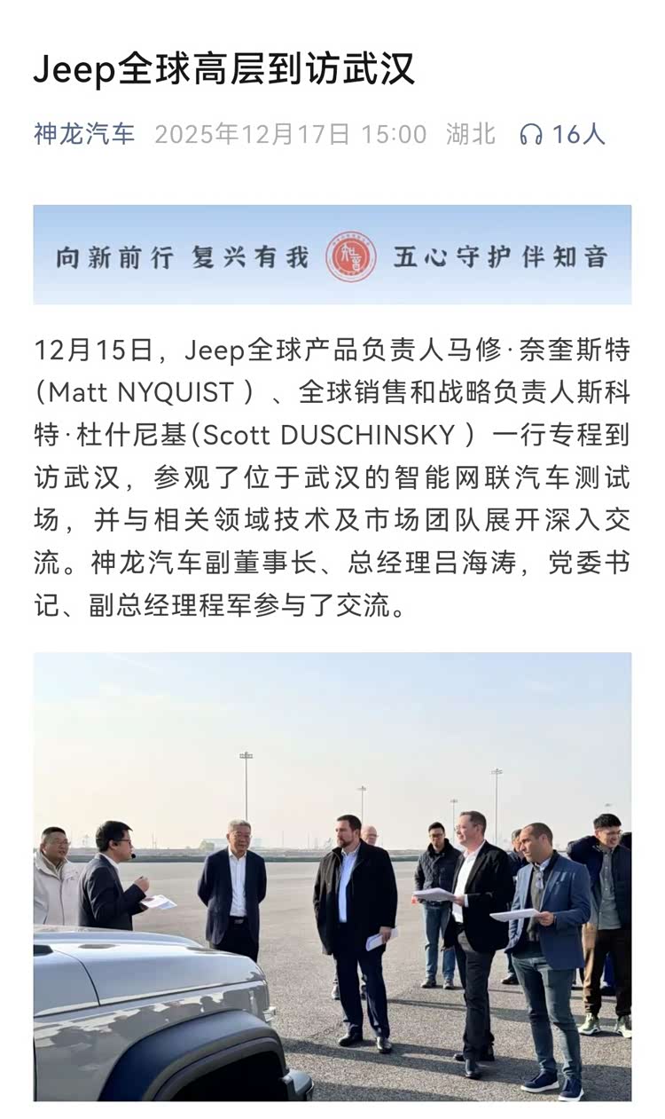 神龙汽车官方账号12月17日的消息,12月15日,Jeep全球产品负责人马修·奈奎斯特(Matt NYQUIST)和全球销售和战略负责人斯科特·杜什尼基(Scott DUSCHINSKY)一行专程到访武汉。他们不仅参观了位于武汉的智能网联汽车测试场,还与相关领域的技术及市场团队进行了深入交流。此次到访的高层与神龙汽车副董事长、总经理吕海涛,党委书记、副总经理程军参与了交流。
