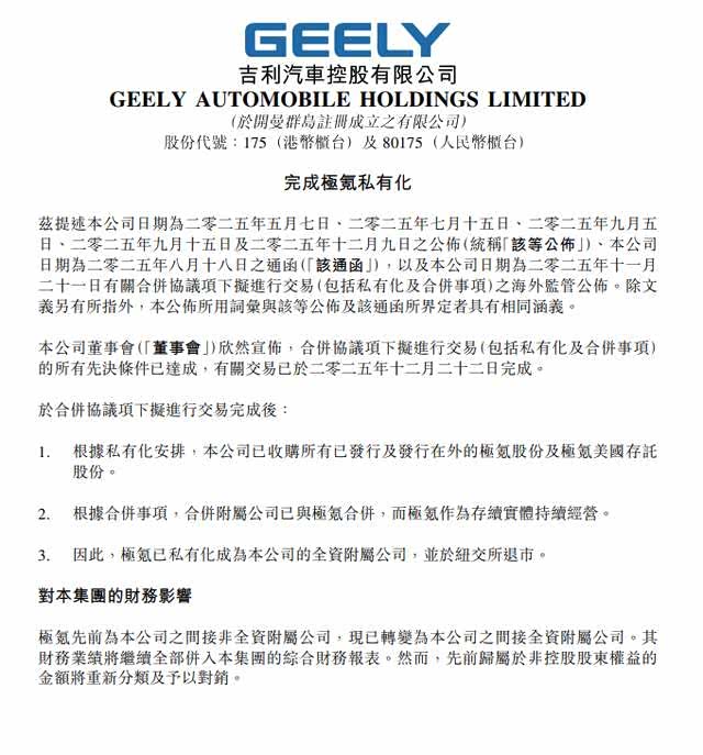 12月22日晚,吉利汽车发布正式公告,宣布已完成对极氪智能科技控股有限公司的私有化及合并交易。即日起,极氪成为吉利汽车的全资附属公司,并从纽约证券交易所退市。