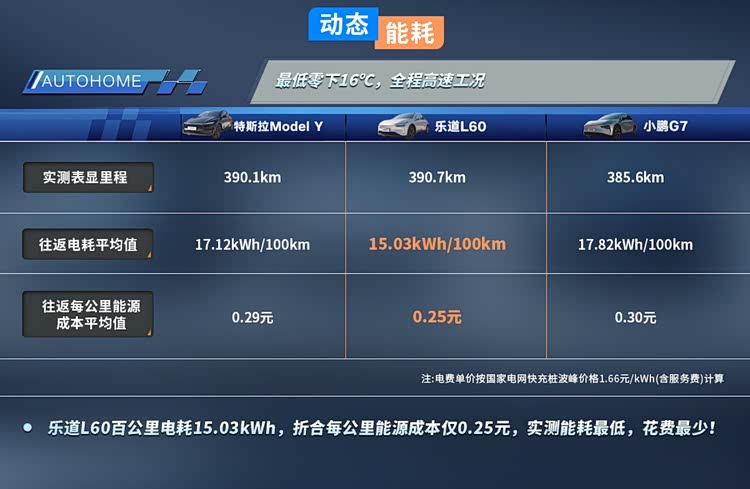 精准的控温能力,也让乐道L60的整体能耗表现大放异彩。实测结果显示,无论是面对1200米海拔落差的上坡攻坚,还是下坡路段的动能回收转化,乐道L60都全方位碾压小鹏G7与特斯拉Model Y。最终数据显示,乐道L60往返电耗平均值仅为15.03kWh/100km,对应的往返每公里能源成本平均值也仅有0.25元,把“温暖不费电”落到了实处。