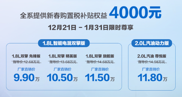 买入门款的朋友,普遍比较在意价格,在意性价比。那 价格方面,和老款双擎先锋版对比,老款现在优惠后裸车9万左右,但是没有购置税补贴,所以实际2026款落地价格也就比老款贵5000元左右,但是2026款空间更大,造型更新,我认为几千的差价,那肯定买新不买旧。但现在新款双擎1.8L E-CVT先锋版 4S店基本没有现车,年前提到车的概率也并不是很大。