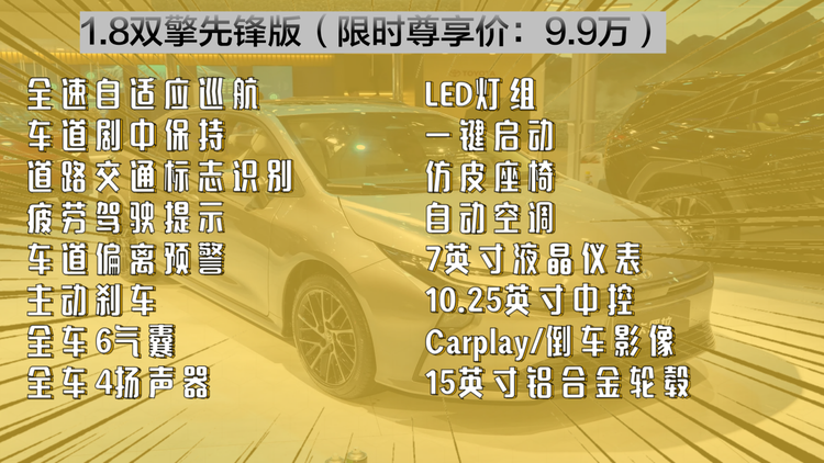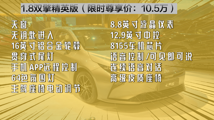 它比1.8L E-CVT先锋版多的配置有天窗、无钥匙进入、16英寸的铝合金轮毂,贯穿式尾灯,手机远程控制,车内多了64色氛围灯,主驾座椅电动调节,然后两块屏幕的尺寸都更大了,还有了8155车机芯片,以及各种语音交互功能。