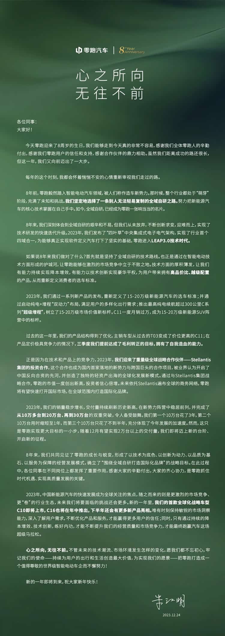 我们需要一些仪式感的总结,只有这样才能更加清晰地面向自己,看到自己,零跑的自我总结是从朱江明每年‘成为习惯’的一封信开始。